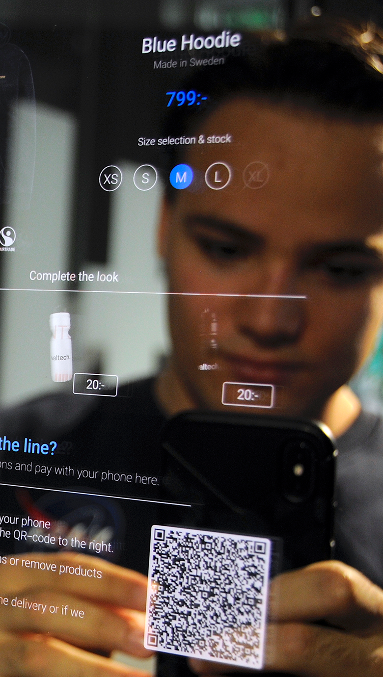 By using RFID-technology, we can follow each item’s sales funnel from the rack to product trial in a dressing room where we have a smart mirror, onwards to purchase, which is done through the shopper’s smartphone. In the dressing room, we acknowledge which product that is brought in for a trial and suggest items that others have tried on (social upsell). We also smooth the path to purchase by making it possible to buy on the spot through the phone - the e-commerce site is only a QR-code away.