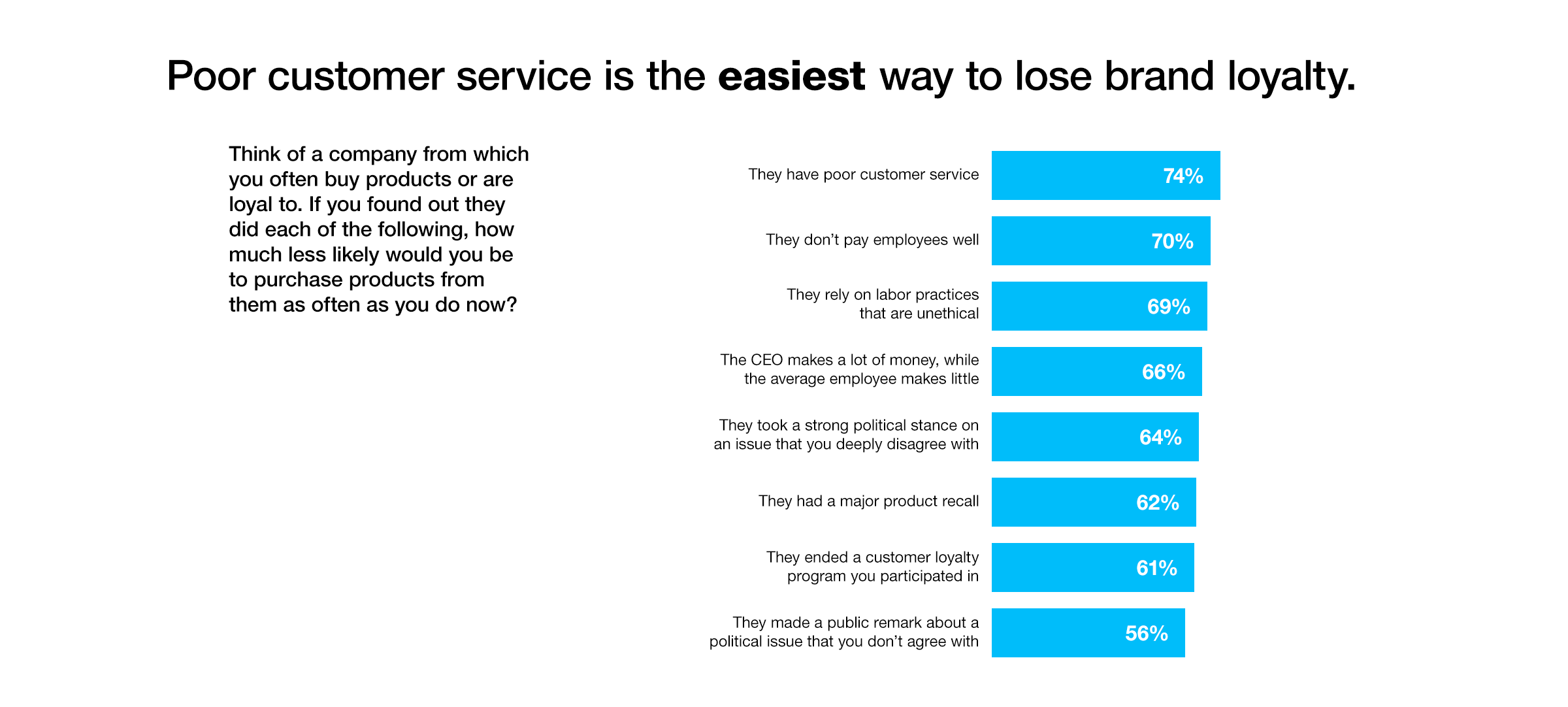 Millennials are even less forgiving. Research from Morning Consult found that “Poor customer service is the easiest way to lose brand loyalty” among Gen Y consumers. The study found 74% of millennials would be less likely to purchase from a brand they’re loyal to if customer service wasn’t up to snuff.