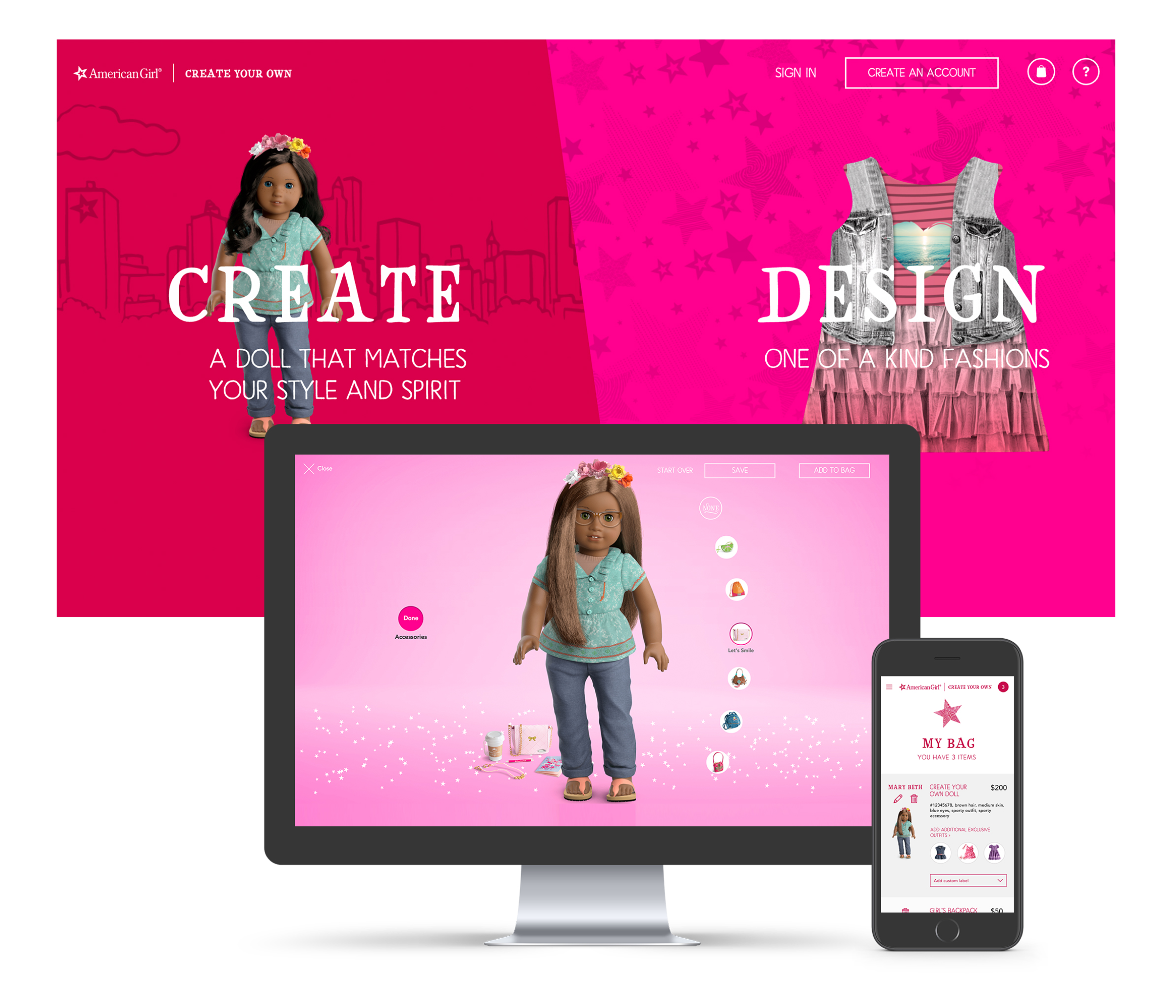 American Girl aims to empower young girls by creating custom dolls and clothing that showcase and celebrate individuality. Building on this objective, we developed a playful doll creation commerce platform that inspires and delivers over 1.3 million doll options to capture girls’ imaginations. The in-store digital experience is essentially a “makers” area called “Create Your Own” that includes 12 digital touch screens integrated with real product options to feel and choose from while you design your dolls and clothing.