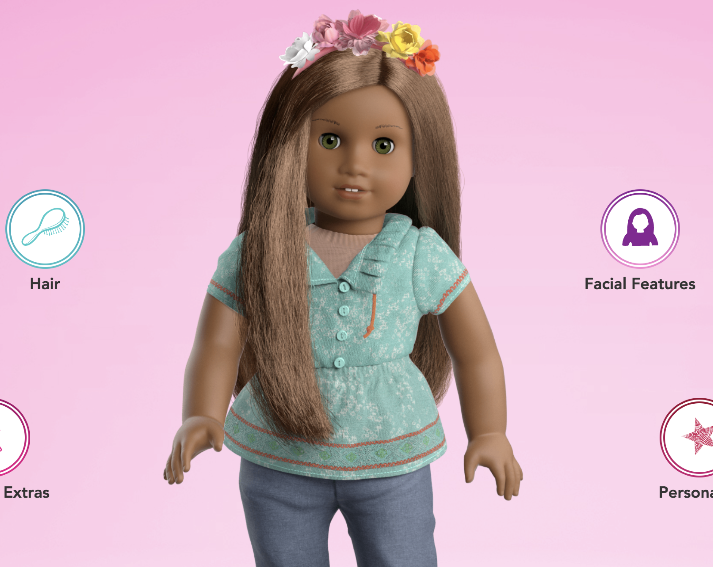 Today’s girls have had screens in their hands their whole lives. We created an interface that their digital sophistication deserves. The animated menu system allows flexible exploration of all the choices while decluttering unnecessary information during the selection process. We also enabled the girls to add their personality to their custom design, including giving their doll a name, a pet, and adding their favourite places and things. The interface, personality, and the ability to begin digital/physical storytelling around the custom dolls all create a unique commerce experience.