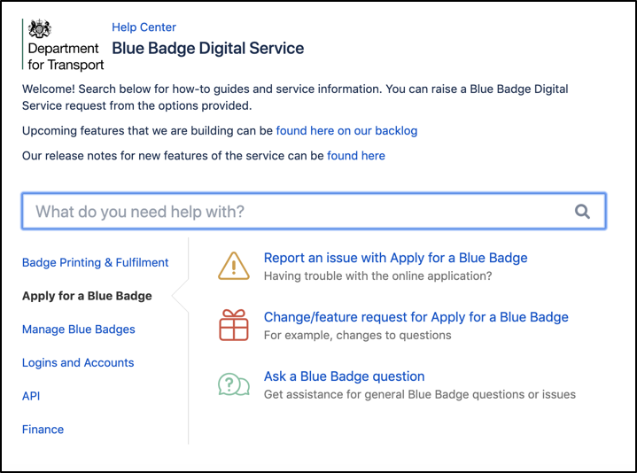 In setting up the service desk and the ‘Knowledge Base’, we encountered a paradox. We wanted to make sure it was as easy as possible for our customers to navigate and raise a support ticket (through plain English terminology that they were familiar with). At the same time, we didn’t want customers raising tickets unless they really had to! The below image is the Blue Badge Digital Service ‘Help Centre’ which Local Authorities access to raise support tickets.